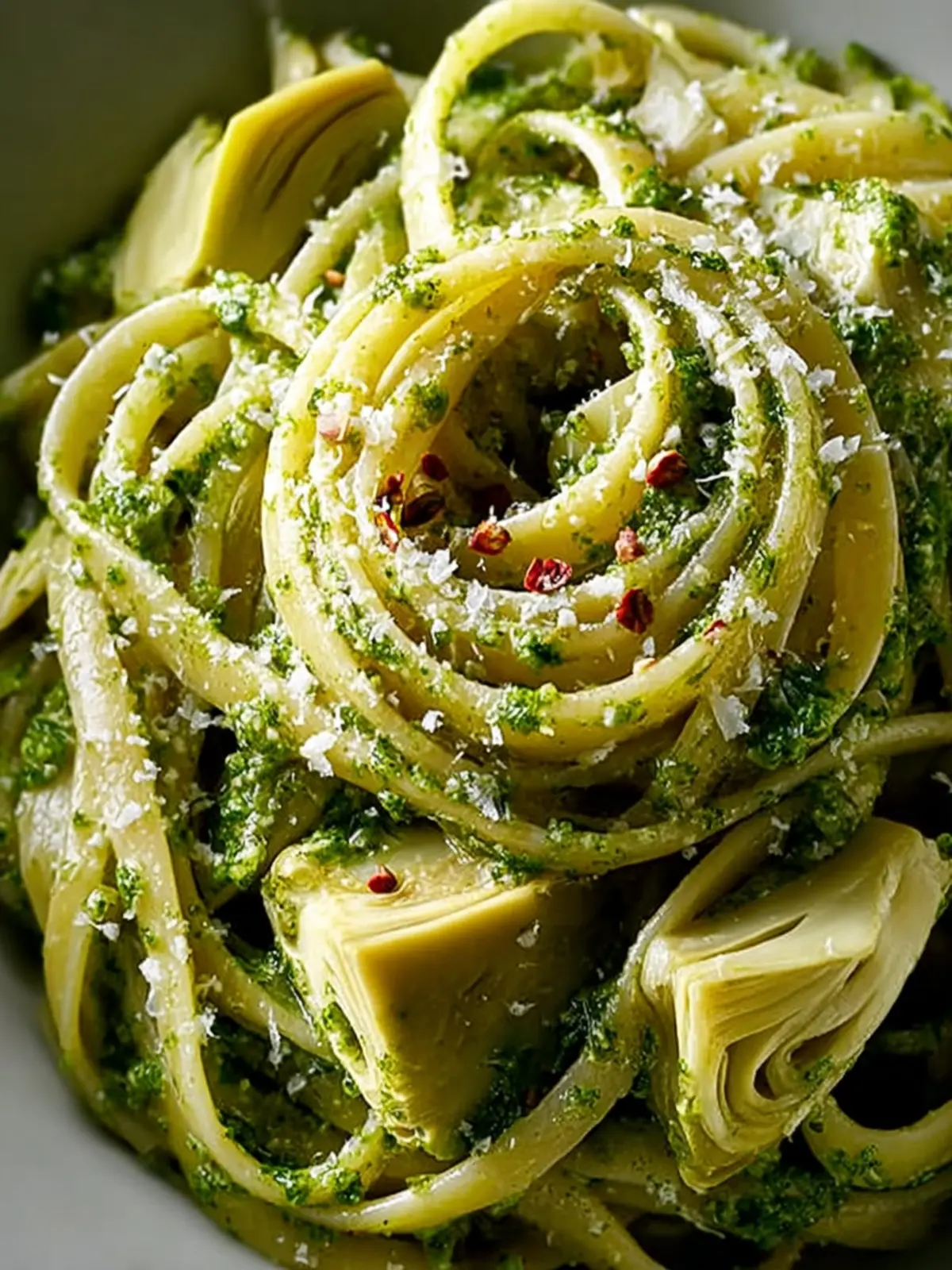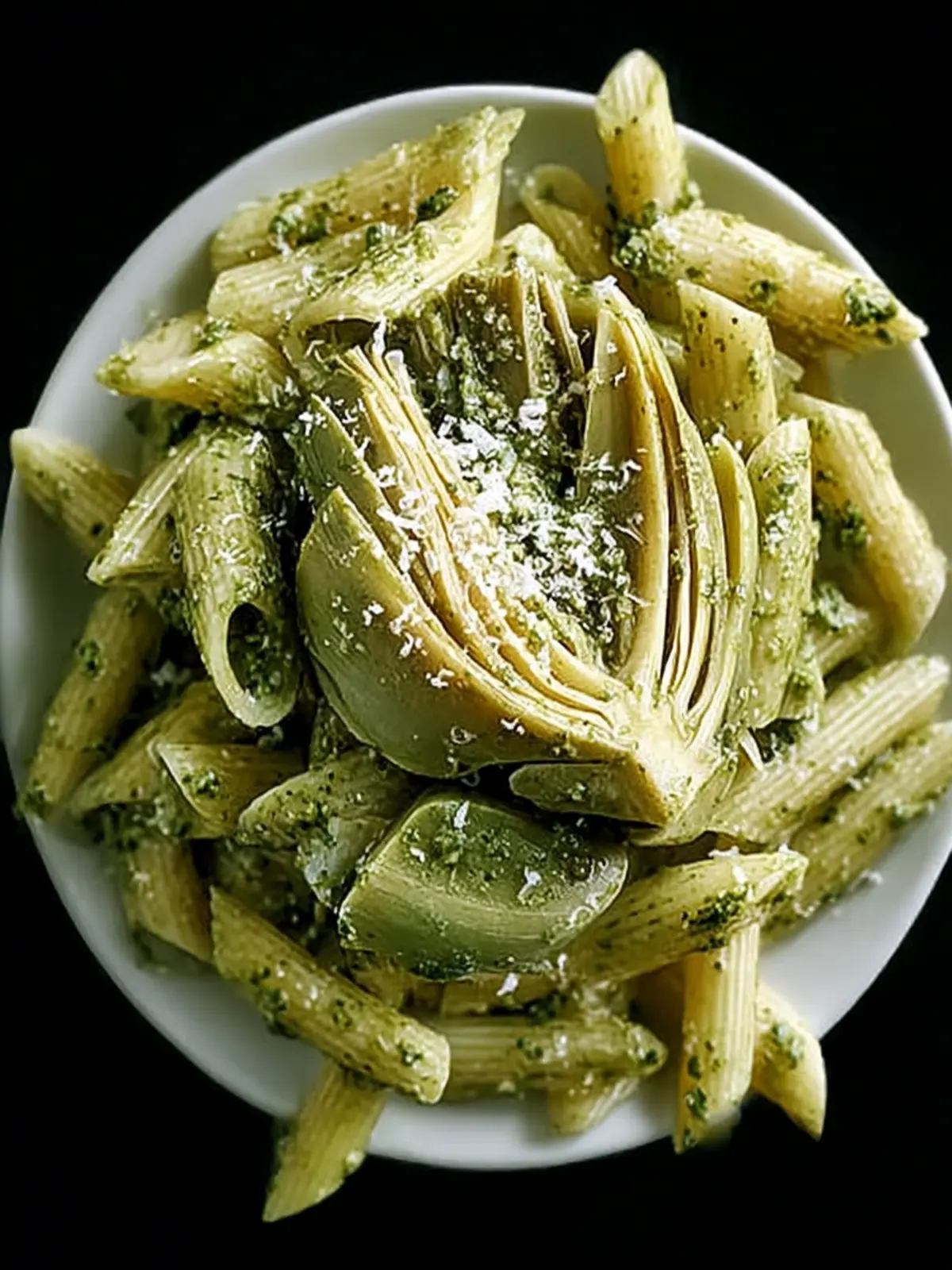 A delicious pasta dish featuring a creamy artichoke pesto, perfect for a quick dinner.