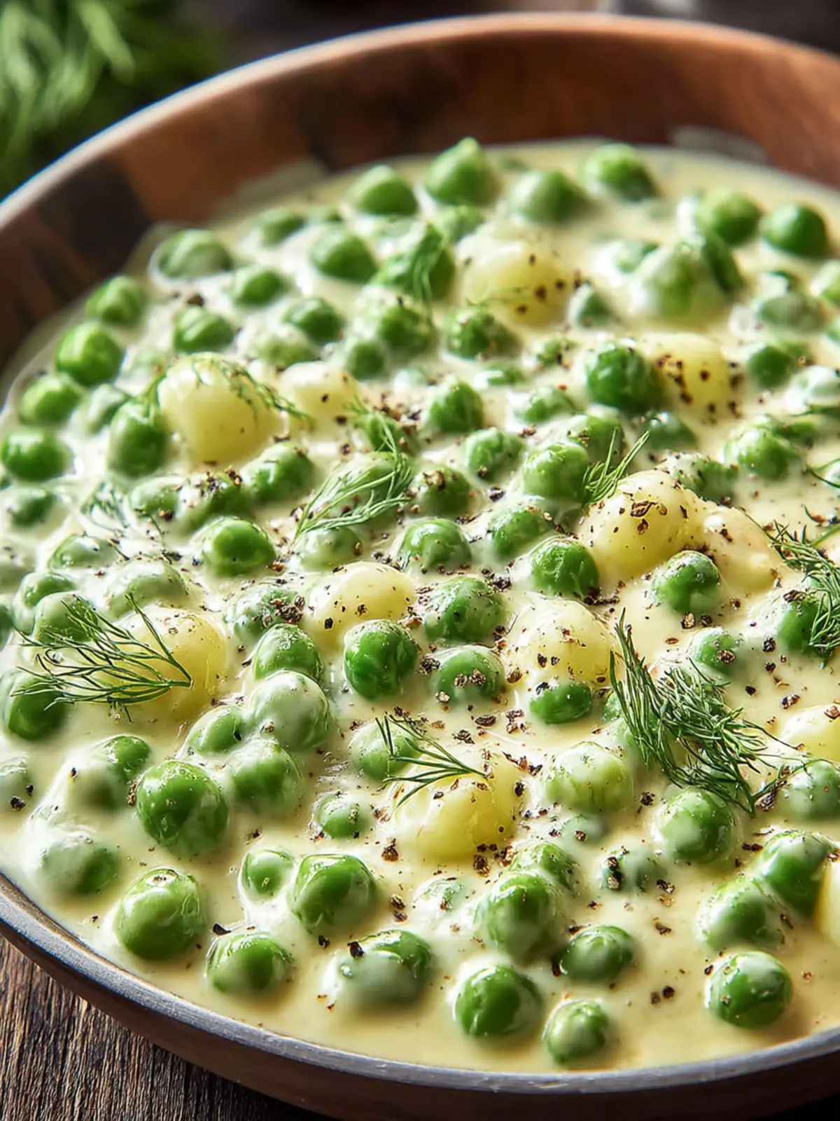 A delightful side dish featuring fresh or frozen peas in a creamy dill sauce.