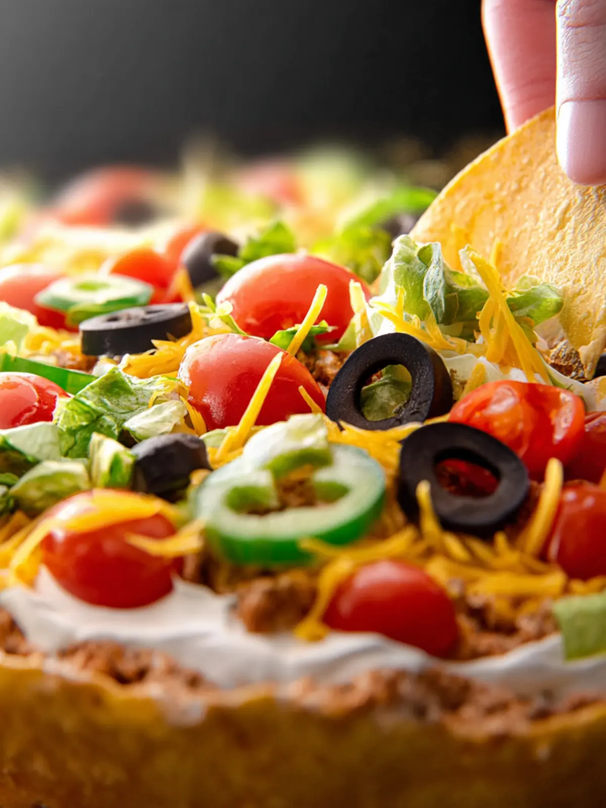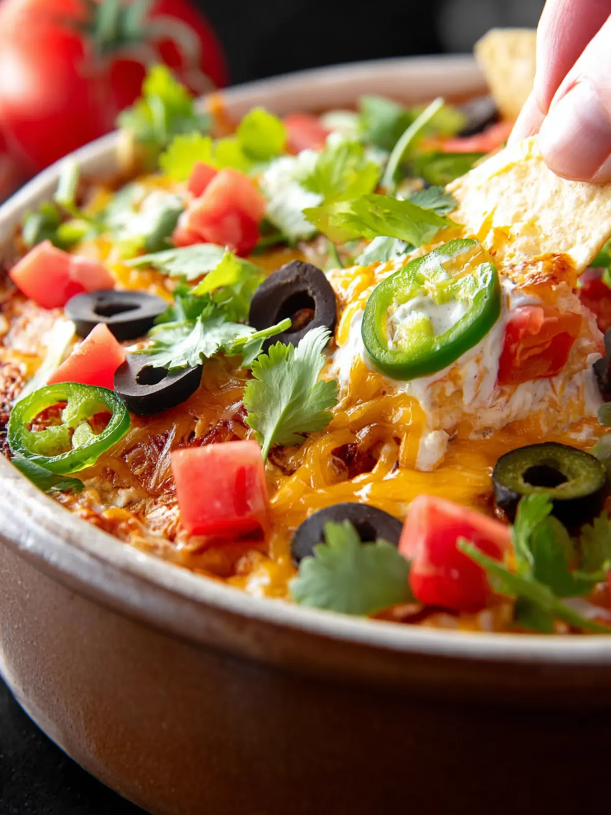 Fresh Toppings: Fresh tomatoes, olives, green onions, and jalapeños add color and crunch to your dip. They not only enhance the flavors but also make the presentation pop!