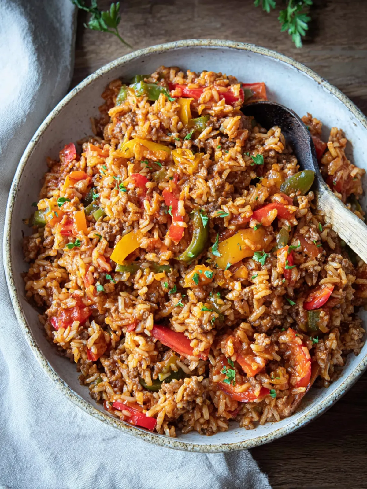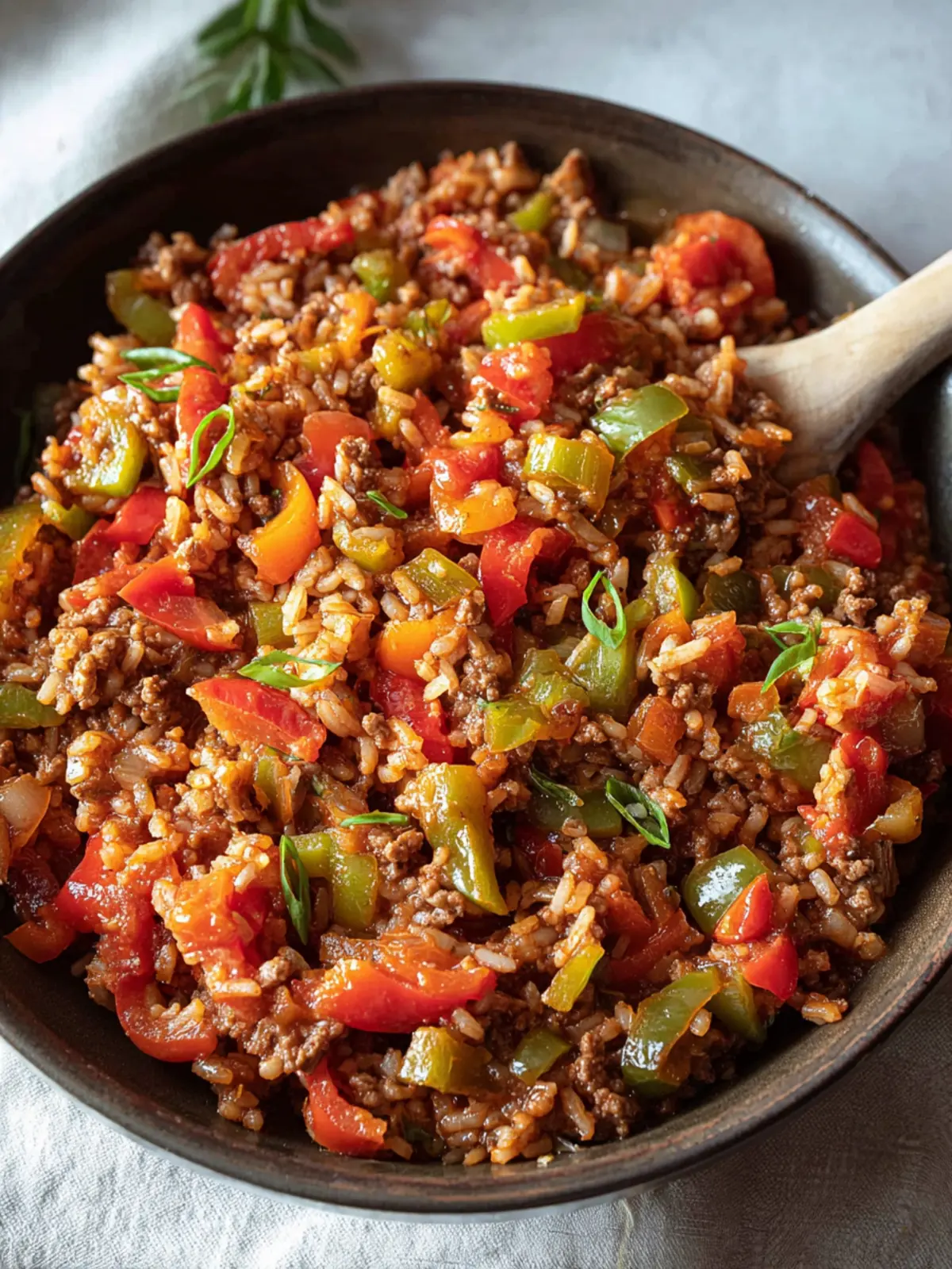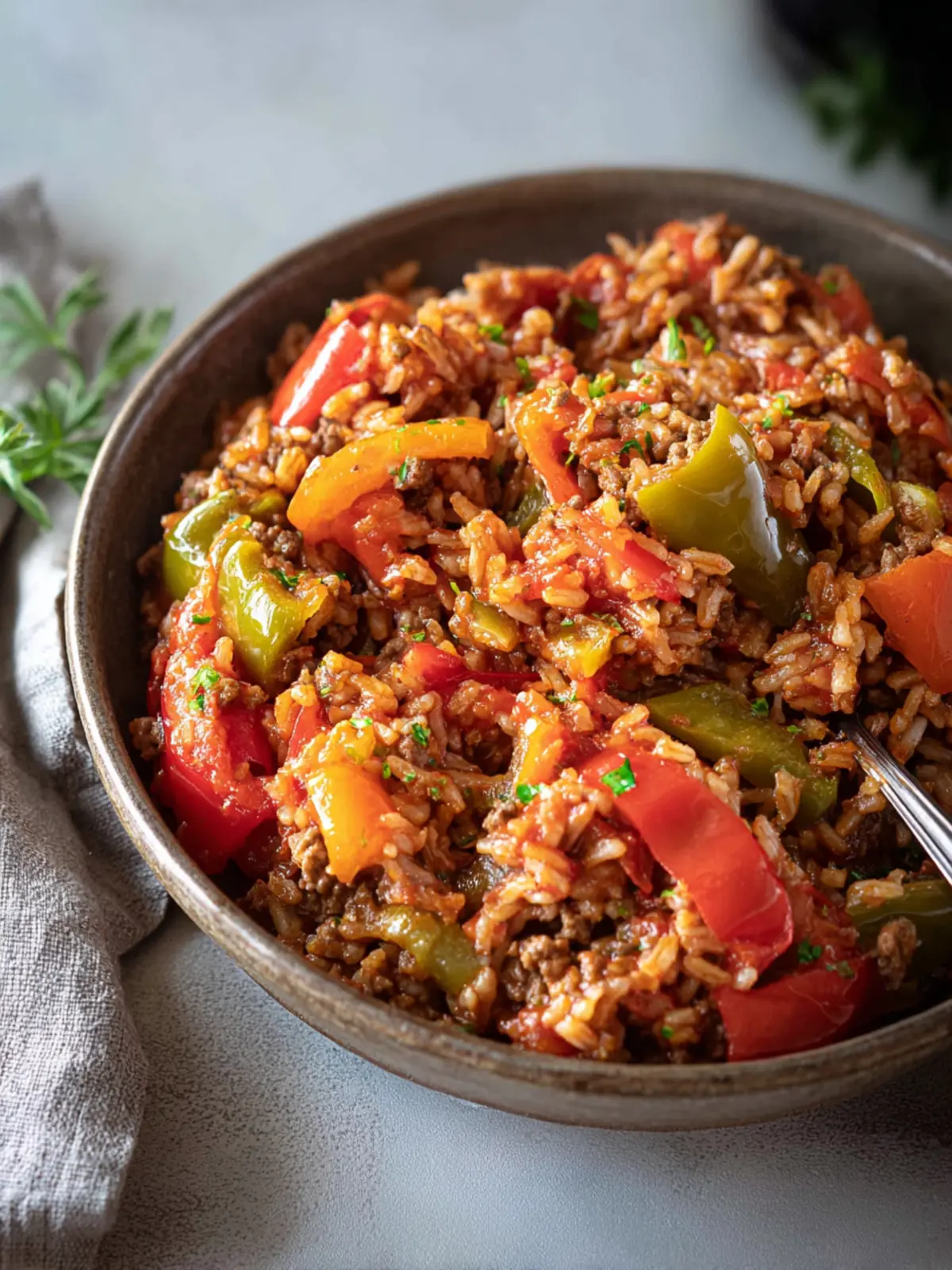 A delicious one-pot meal with ground beef, bell peppers, and rice, seasoned to perfection.