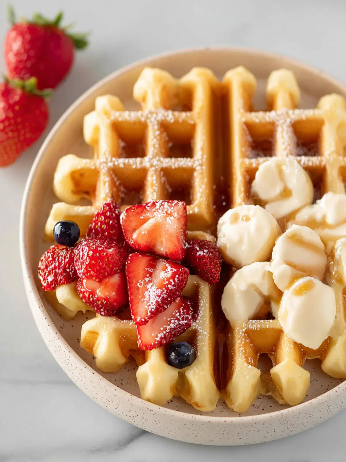 - Waffles can be served with various toppings such as fruits, syrup, or whipped cream.