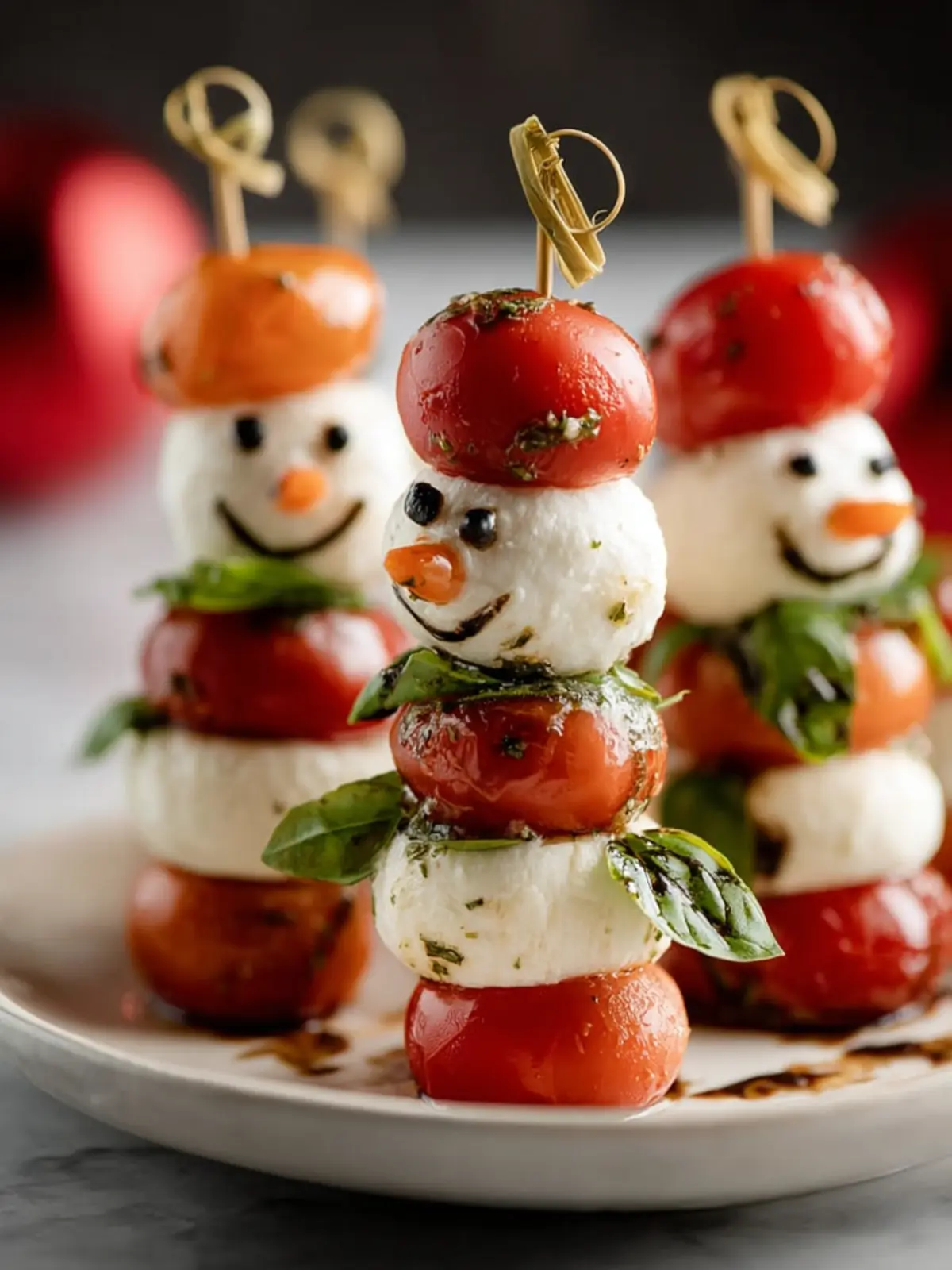 - Pesto Drizzle: Add a drizzle of basil or sun-dried tomato pesto on top of your snowmen for a burst of flavor that complements the mozzarella and tomatoes beautifully.