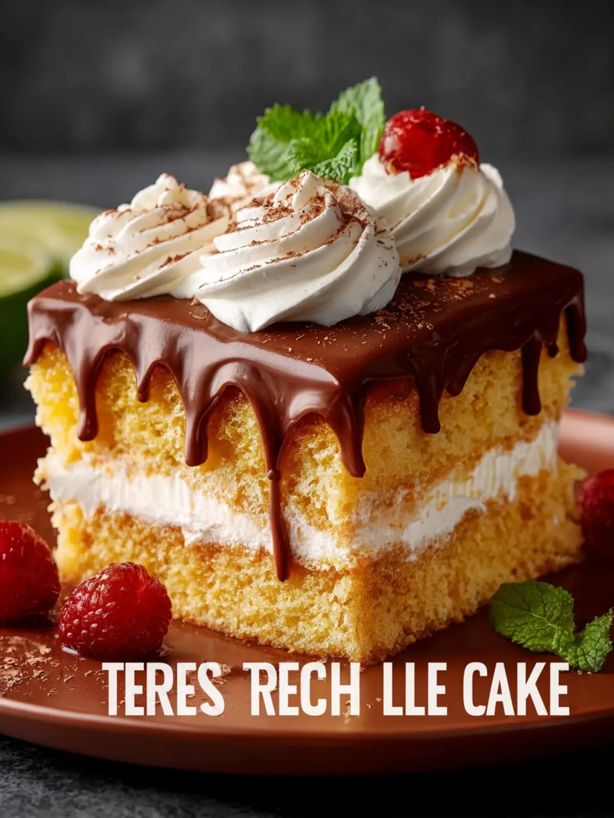 A delicious chocolate sponge cake soaked in a creamy tres leches filling and topped with silky chocolate ganache.