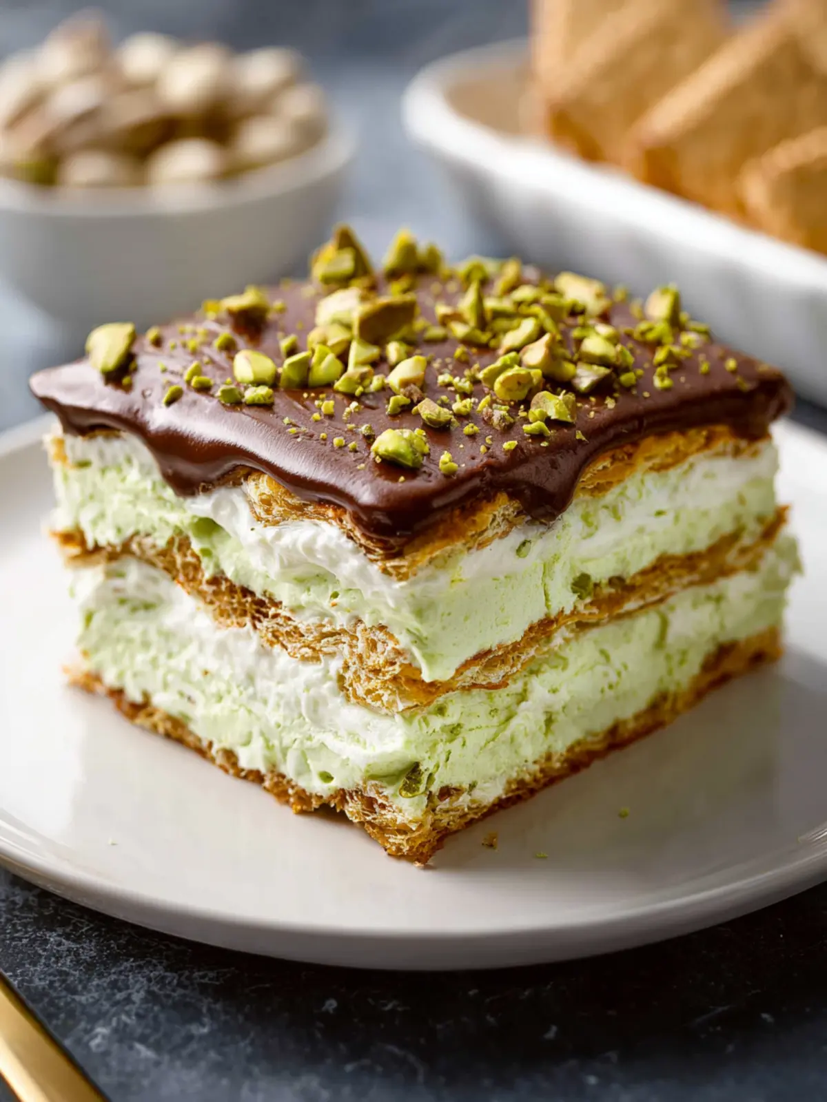 Prepare to indulge in the charming world of Pistachio Eclair Cake, where the delight of a classic French dessert meets the unique and nutty flavor of pistachios. This cake isn’t just a visual masterpiece with its elegant layers; it’s a celebration of flavors that will make your taste buds sing. Picture this: a creamy pistachio filling nestled between layers of light and airy pastries, all coated in a luscious glaze. It’s a dessert that effortlessly transforms any occasion into something special, whether it’s a casual gathering or a formal celebration.
