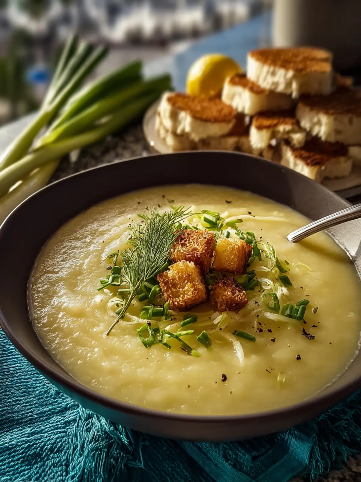 A creamy and comforting leek and potato soup, perfect for a cozy meal.