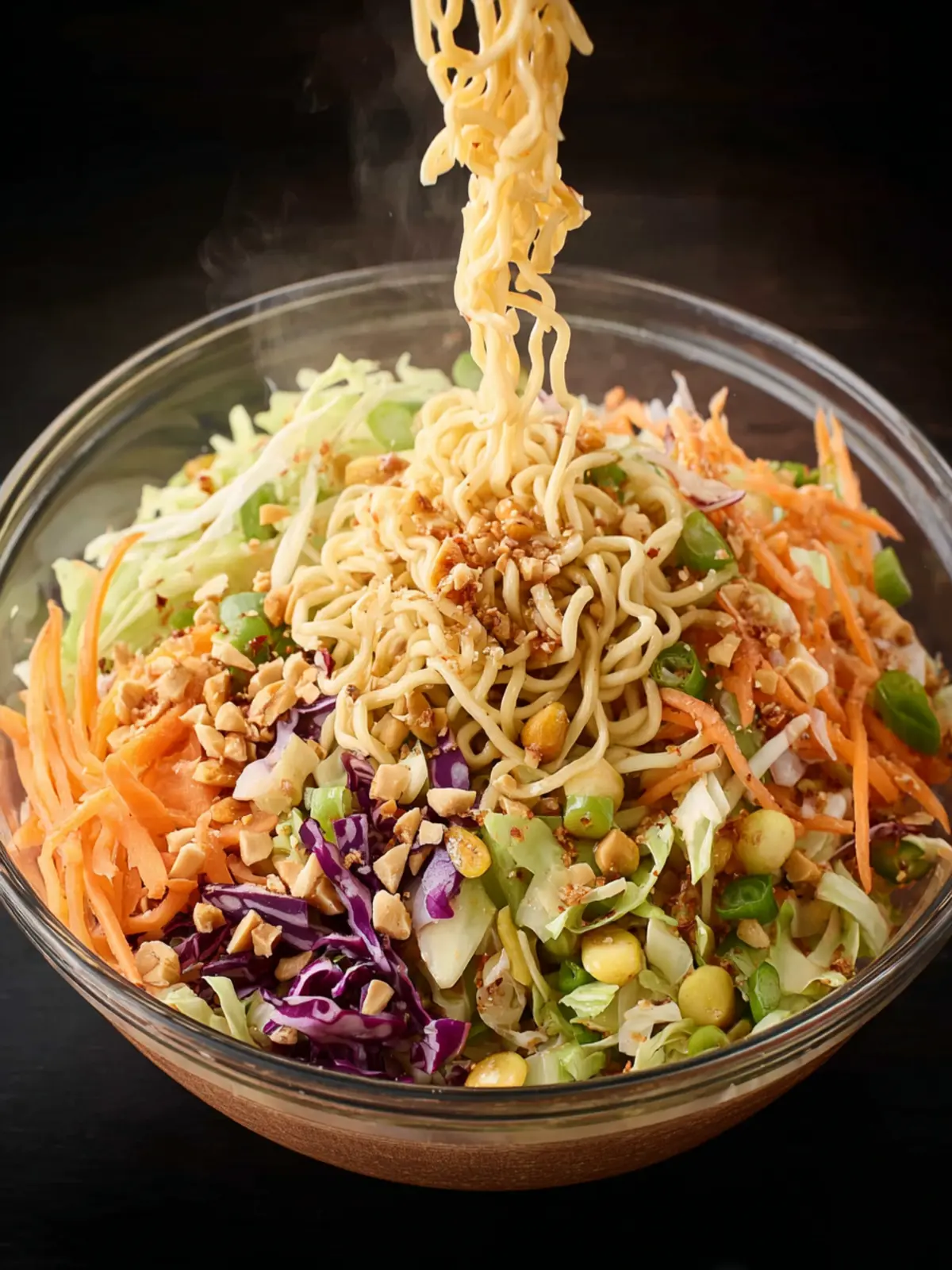 Once your ingredients are prepped, mixing the salad can be done in just 5 minutes. Combine the dry ramen noodles, shredded veggies, and the dressing, giving everything a good toss.