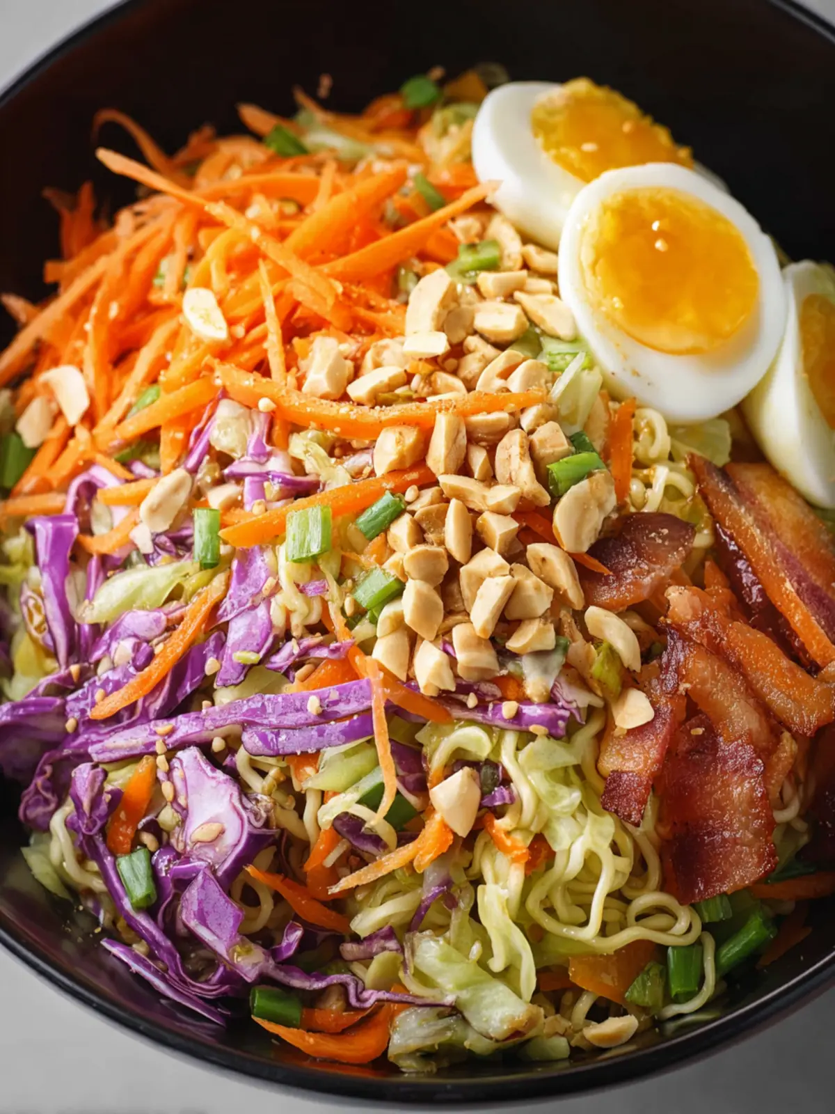 If you’re concerned with carbs, this salad has around 25 grams per serving. Most of these carbs come from the ramen noodles and vegetables, making it a balanced choice post-workout or during a busy day.