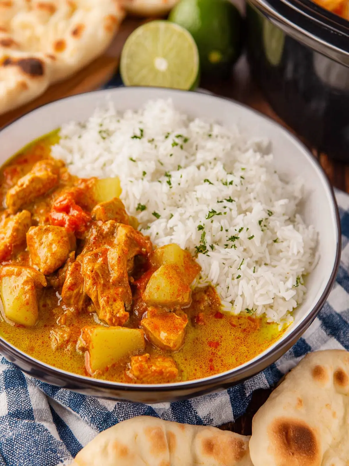 - Steamed basmati rice: Its fluffy texture perfectly balances the curry’s creaminess.