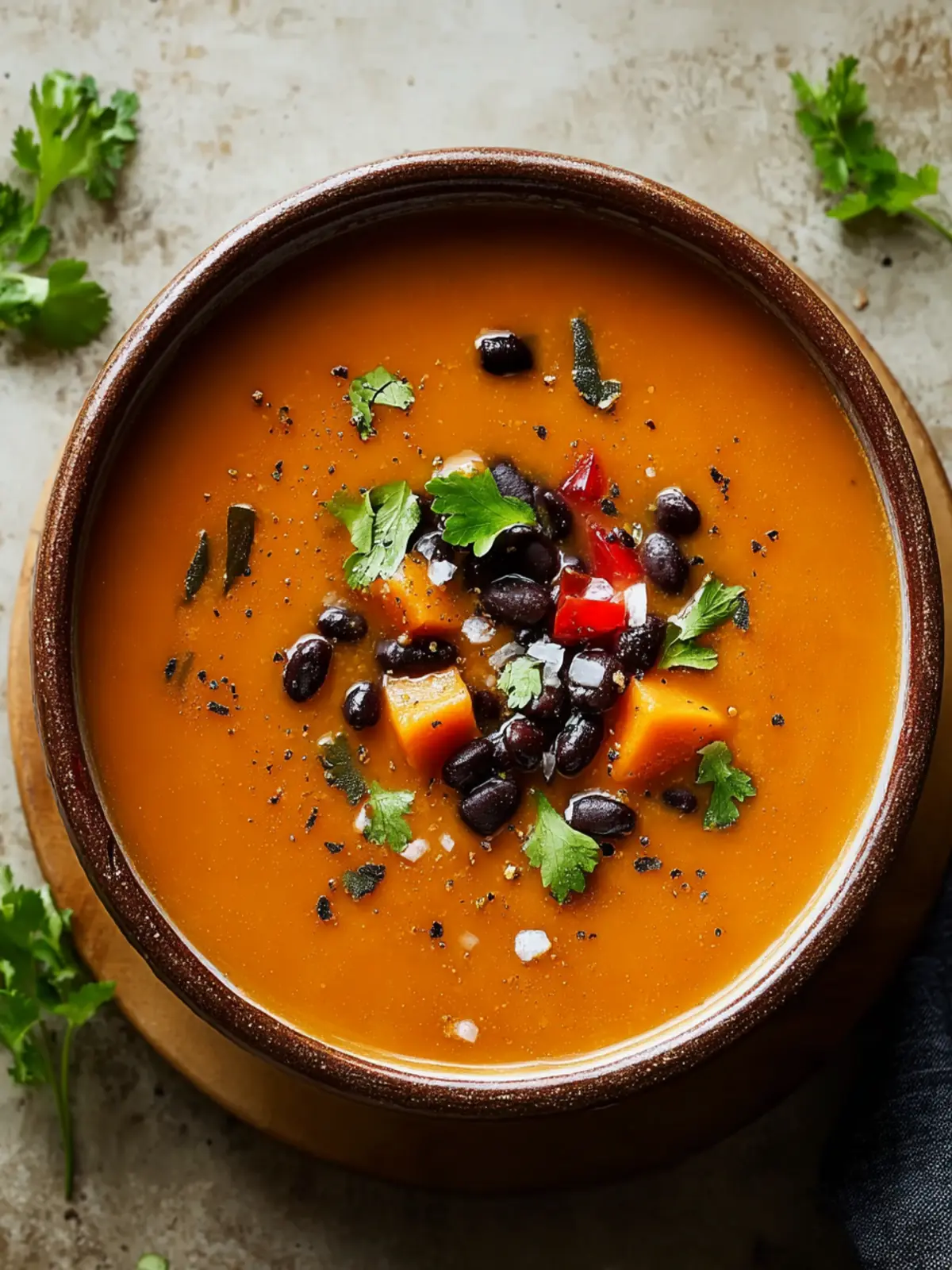 A warm and comforting soup made with roasted sweet potatoes and black beans, seasoned with garlic and spices for a smoky flavor.