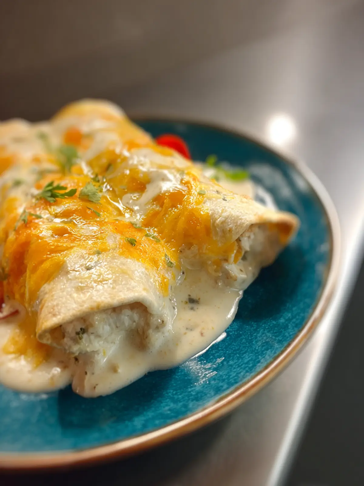 Delicious cheesy chicken enchiladas topped with a creamy sauce and baked to perfection.
